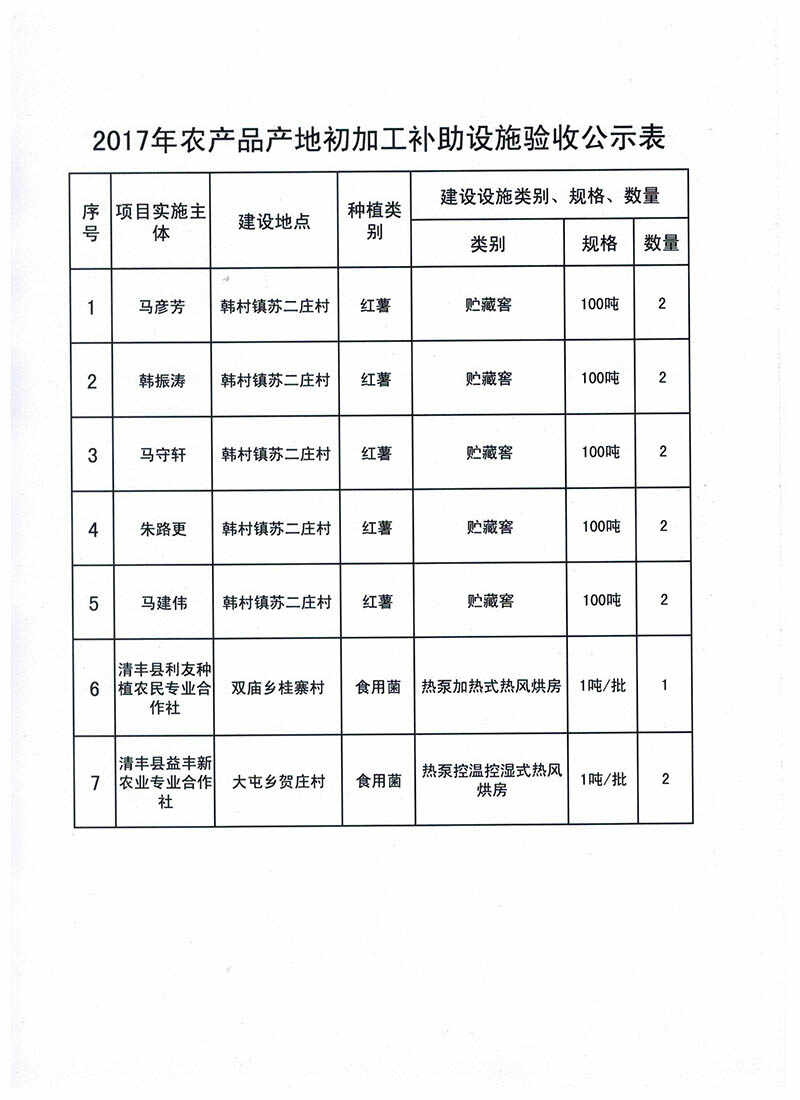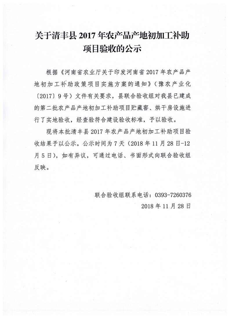 现将本批清丰县2017年农产品产地初加工补助项目验收结果予以公示。公示时间为7天(2018年11月28日-12月5日),如有异议,可通过电话、书面形式向联合验收组反映。