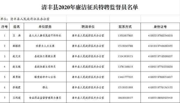 清丰县2020年廉洁征兵特聘监督员名单