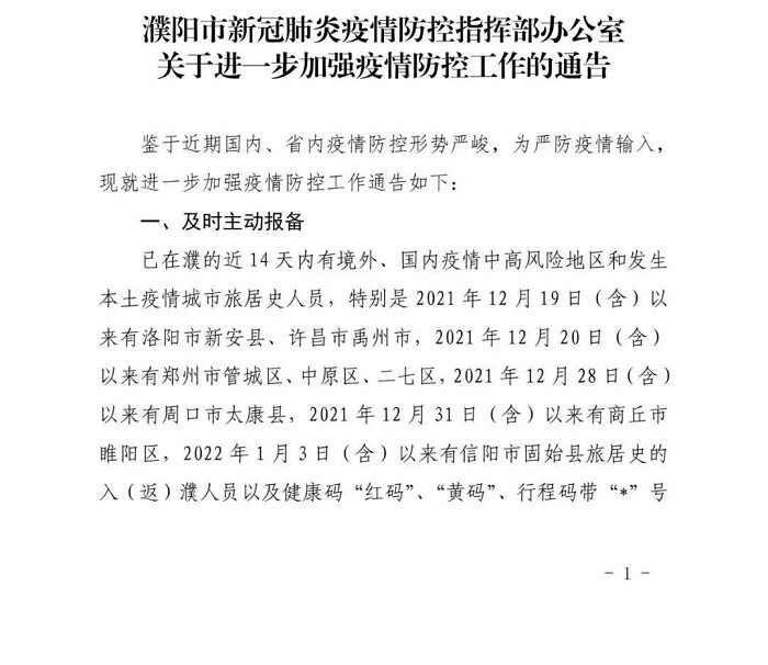 濮阳市新冠肺炎疫情防控指挥部办公室关于进一步加强疫情防控工作的通告