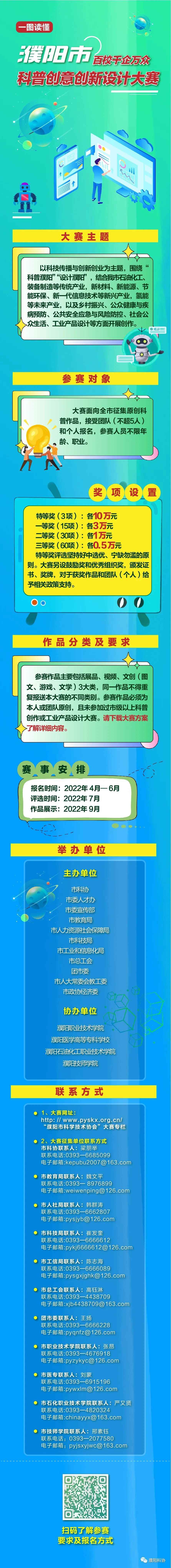 据大赛组委会工作人员介绍,此次大赛以“科技传播与创新创业”为主题,围绕“科普濮阳”“设计濮阳”,结合我市石油化工、装备制造等传统产业,新材料、新能源、节能环保、新一代信息技术等新兴产业,氢能等未来产业,以及乡村振兴、公众健康与疾病预防、公共安全应急与风险防控、社会公众生活、工业产品设计等方面开展创作。