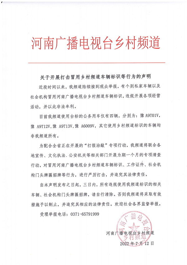 关于开展打击冒用乡村频道车辆标识等行为的声明