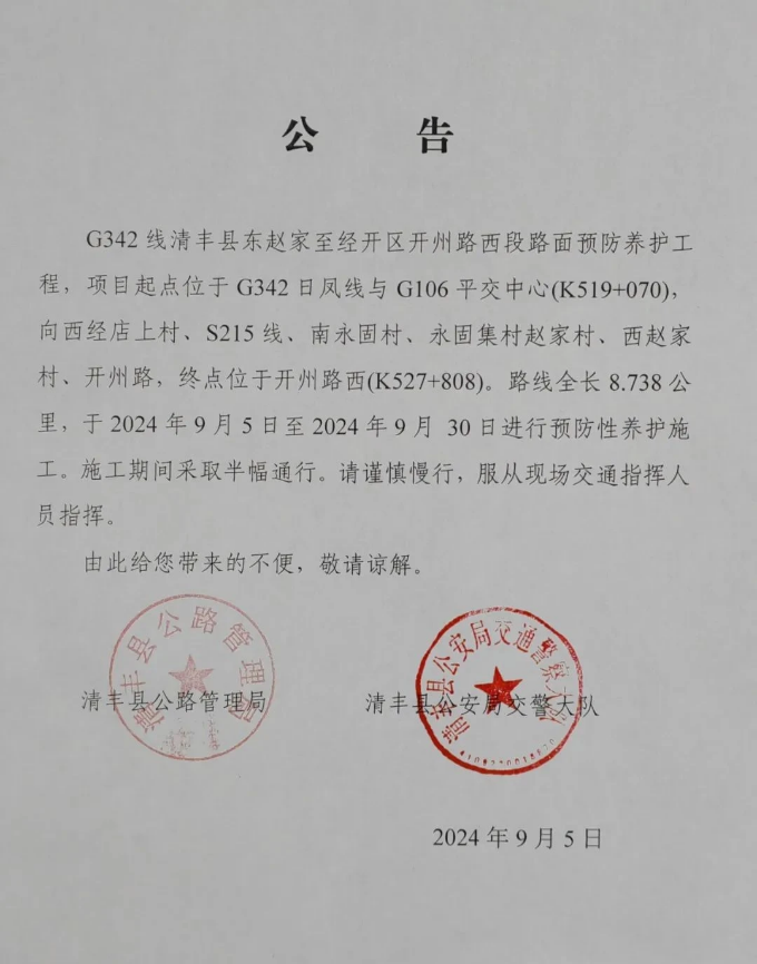 G342线清丰县东赵家至经开区开州路西段路面预防养护工程,项目起点位于 G342 日凤线与 G106 平交中心(K519+070),向西经店上村、S215 线、南永固村、永固集村赵家村、西赵家村、开州路,终点位于开州路西(K527+808)。路线全长8.738公里,于2024年9月5日至2024年9月30日进行预防性养护施工。施工期间采取半幅通行。请谨慎慢行,服从现场交通指挥人员指挥。