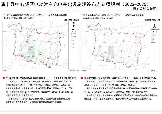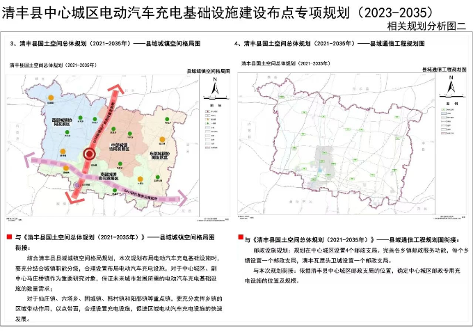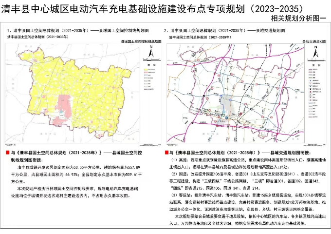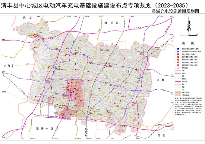 至2035年,清丰县县域结合现状加油站、洗车店、规划商业用地等力争规划集中式充换电站44座、558个充电桩(含中心城区9座,159个充电桩)。