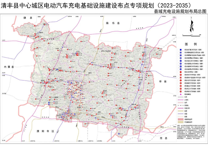 规划至2035年,清丰县县域范围内共规划充电基础设施310处,共3981个充电桩。