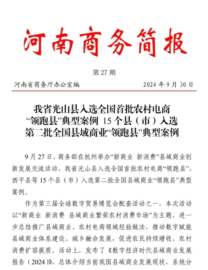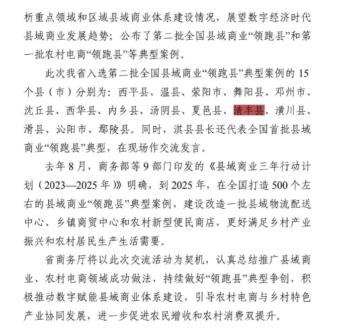9 月 27 日,商务部在杭州举办“新商业 新消费”县域商业创新发展交流活动。清丰县成功入选全国县域商业“领跑县”典型案例。