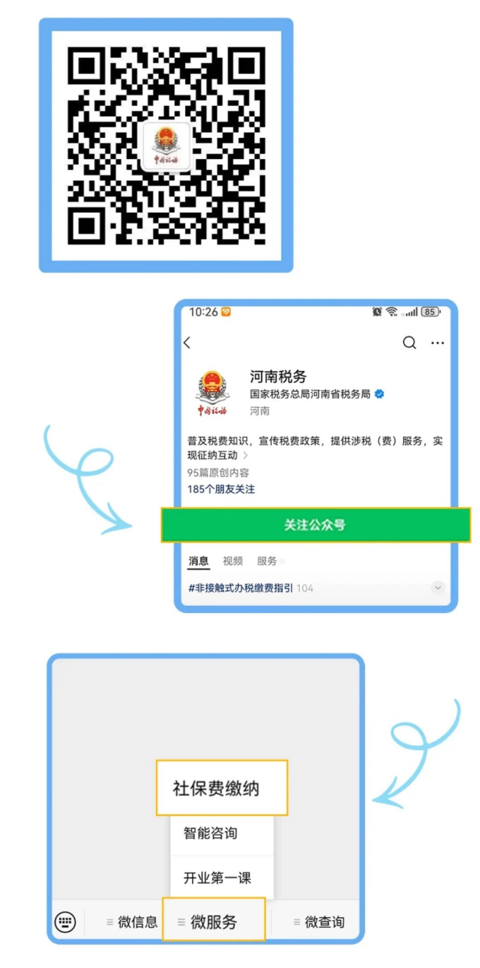 关注“河南税务”微信公众号,选择【微服务】—【社保费缴纳】,即进入“河南税务”微信小程序。