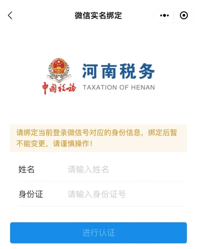 “河南税务”微信小程序需在您完成身份认证后,方能办理业务。