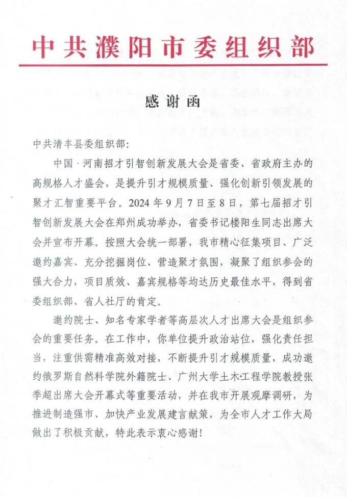 10月9日,中共濮阳市委组织部发来感谢函,对中共清丰县委组织部在中国·河南招才引智创新发展大会上做出的积极贡献表示肯定和感谢。县委书记高尚功对人才工作予以批示。