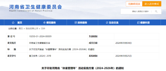 《方案》明确:从2024年开始到2026年,河南省计划用3年的时间,建立完善有利于促进居民预防控制超重、肥胖和体重管理的政策环境支持体系。