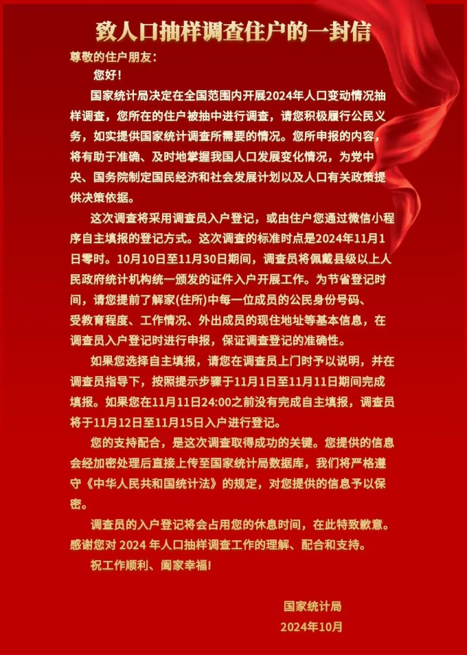 特别提醒:国家样本2024年设置了儿童早期发展专题调查指标,如果您家中有2至4周岁的儿童,请您配合调查员完成相关调查问题。