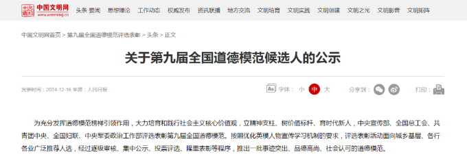 评选表彰活动现已进入候选人公示环节。经主办单位严格审查,共确定第九届全国道德模范候选人299名,其中,“助人为乐”类63名,“见义勇为”类58名,“诚实守信”类59名,“敬业奉献”类65名,“孝老爱亲”类54名。12月16日至20日,候选人在《人民日报》《解放军报》集中公示,人民网、新华网、央视网、中国军网、光明网、中国经济网、中国文明网、中工网、中国青年网、中国妇女网同步公示。