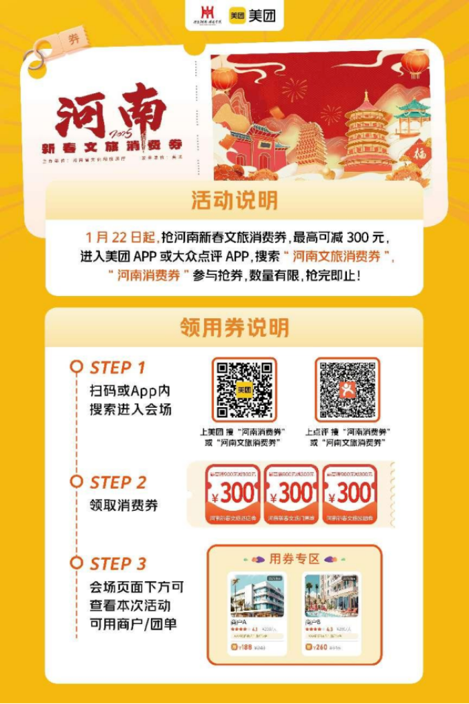 用户进入美团或大众点评APP,搜索“河南消费券”“河南文旅消费券”,进入活动页面点击“领取”按钮即可获得酒店、门票、线路业态的2025河南省新春文旅消费券;或可查看页面专区内参与活动的酒店/景区,在预订客房/景点门票时点击“领券订”按钮,即可有机会获得酒店、景区业态的2025河南省新春文旅消费券。在每个发放周期内,同一用户可使用一张河南新春文旅酒店券,一张河南新春文旅门票券和一张河南新春文旅跟团券,最多可使用三张。成功领取的消费券可在“美团APP-我的-红包卡券-我的券”或“大众点评-我的-卡券-券包”页面查看。活动期间,消费券数量有限,领完即止。