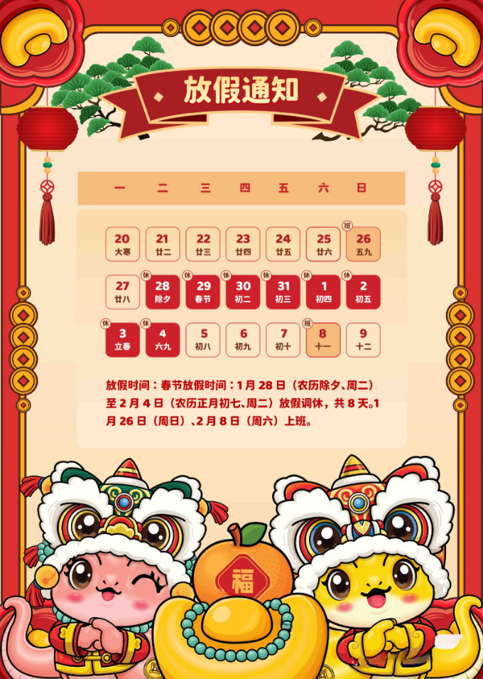 1月28日(农历除夕、周二)至2月4日(农历正月初七、周二)放假调休,共8天。1月 26日(周日)、2月8日 (周六)上班。