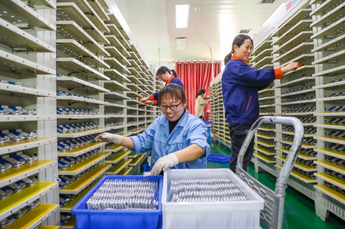 近年来,河南省清丰县通过加强政策扶持,引入产业项目,增强技能培训,提供就业机会,促进农民增收。图为3月19日,清丰县韩村镇任韩村一家电池厂的工人正在整理锂离子电池。