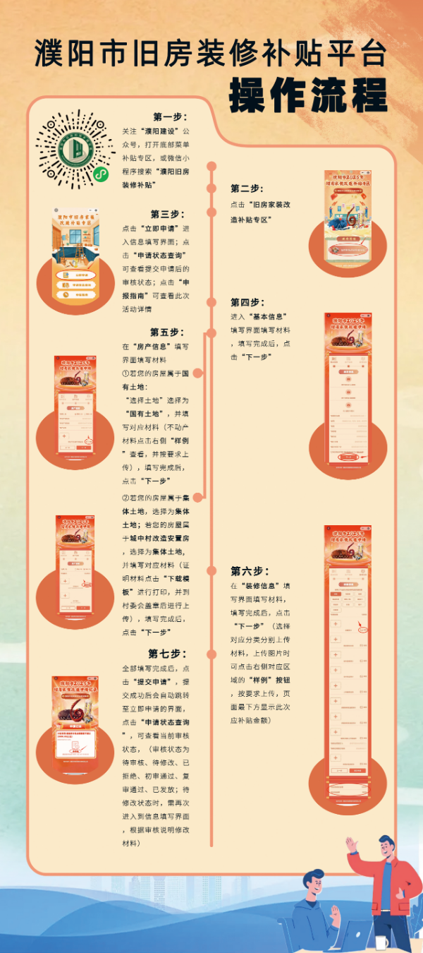 符合补贴条件并有意愿申请补贴资金的消费者,应于2025年12月20日24时前,通过微信搜索并关注“濮阳建设”公众号,进入“濮阳市2025年旧房家装改造申请”专区,清晰、完整、准确填报提交申报材料。 申报材料包括:居民身份证、房产证明材料、装修、发票、支付凭证、房屋装修改造前和装修改造后(或装修开工后施工)照片、产权人银行账号等。集体土地上合法住宅和城中村改造安置房无房产证明材料的,可由村、居委会出具证明材料。