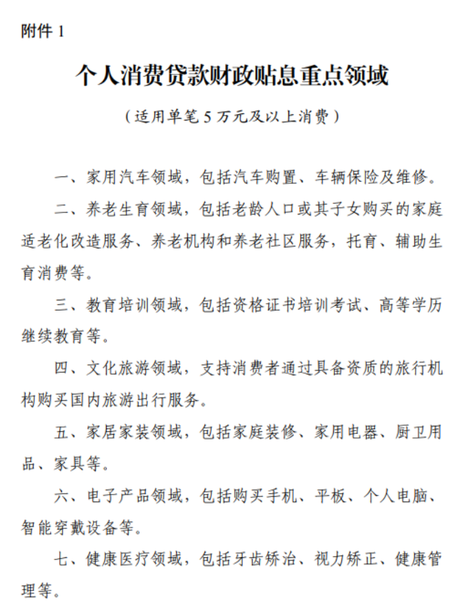 1.个人消费贷款财政贴息重点领域(适用单笔5万元及以上消费)