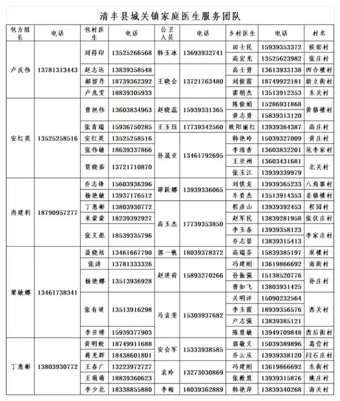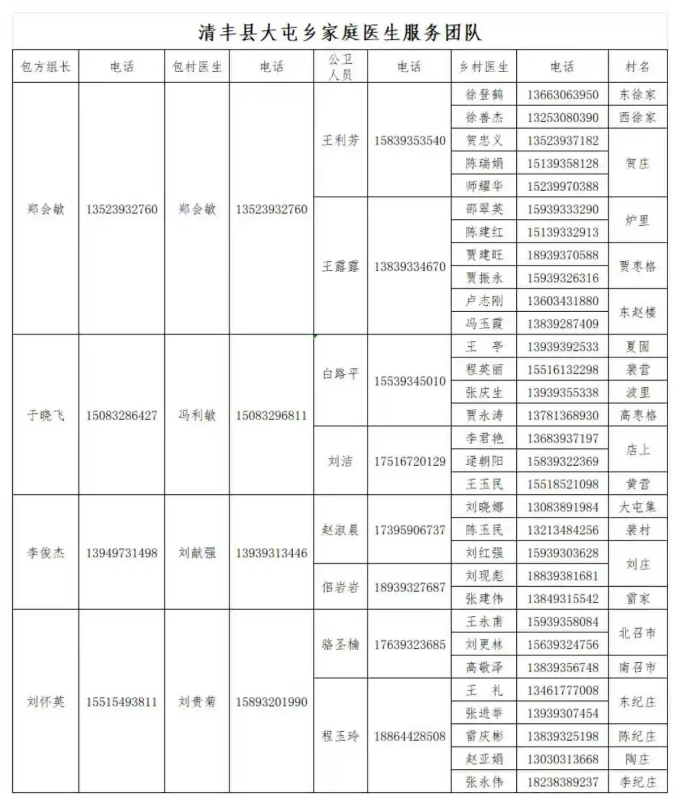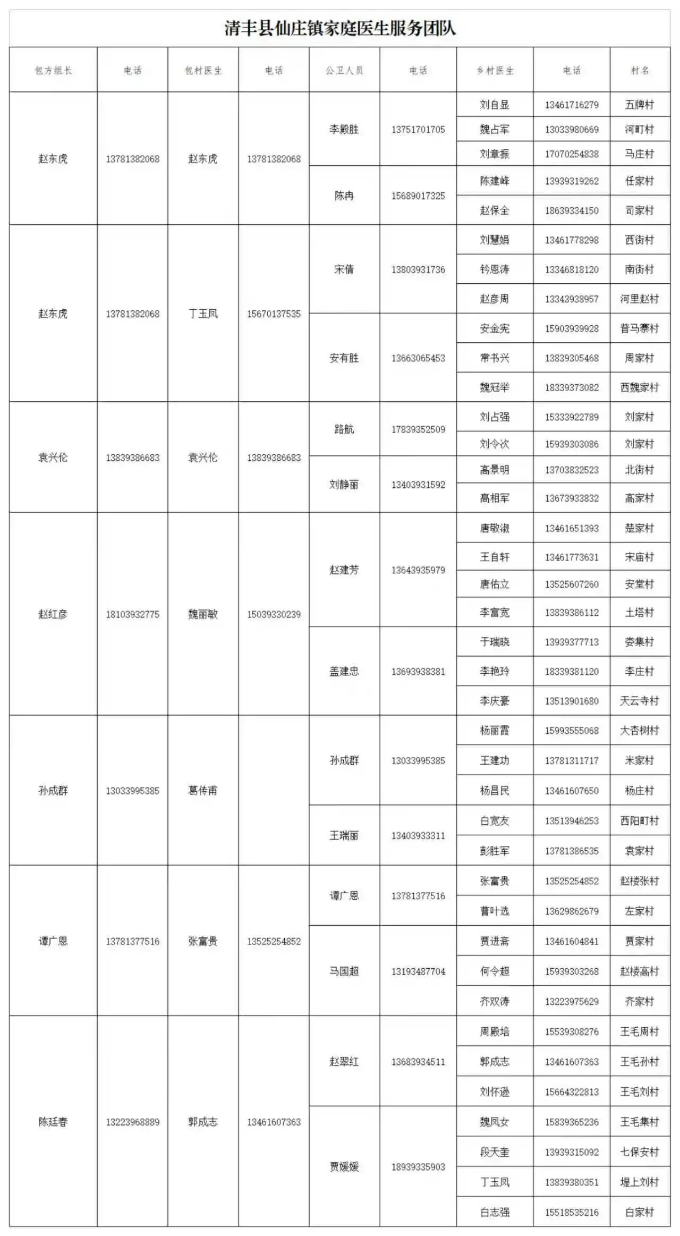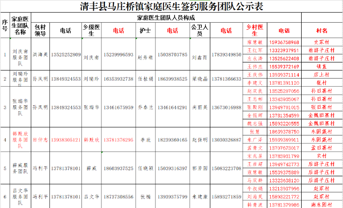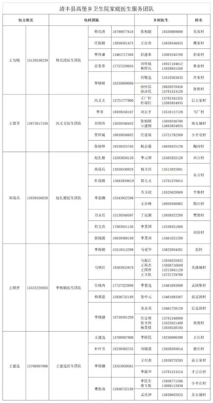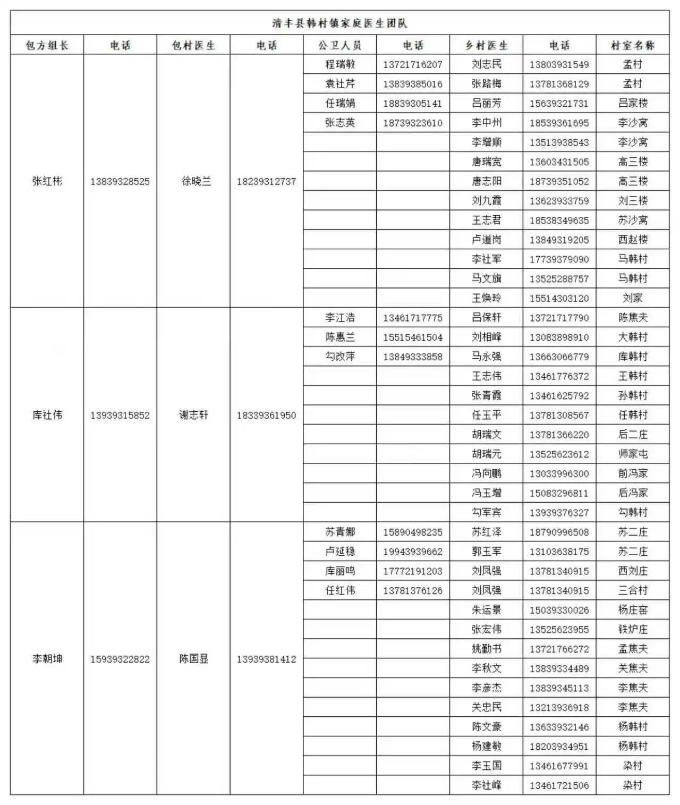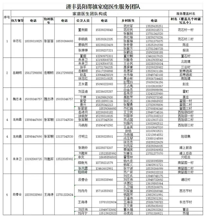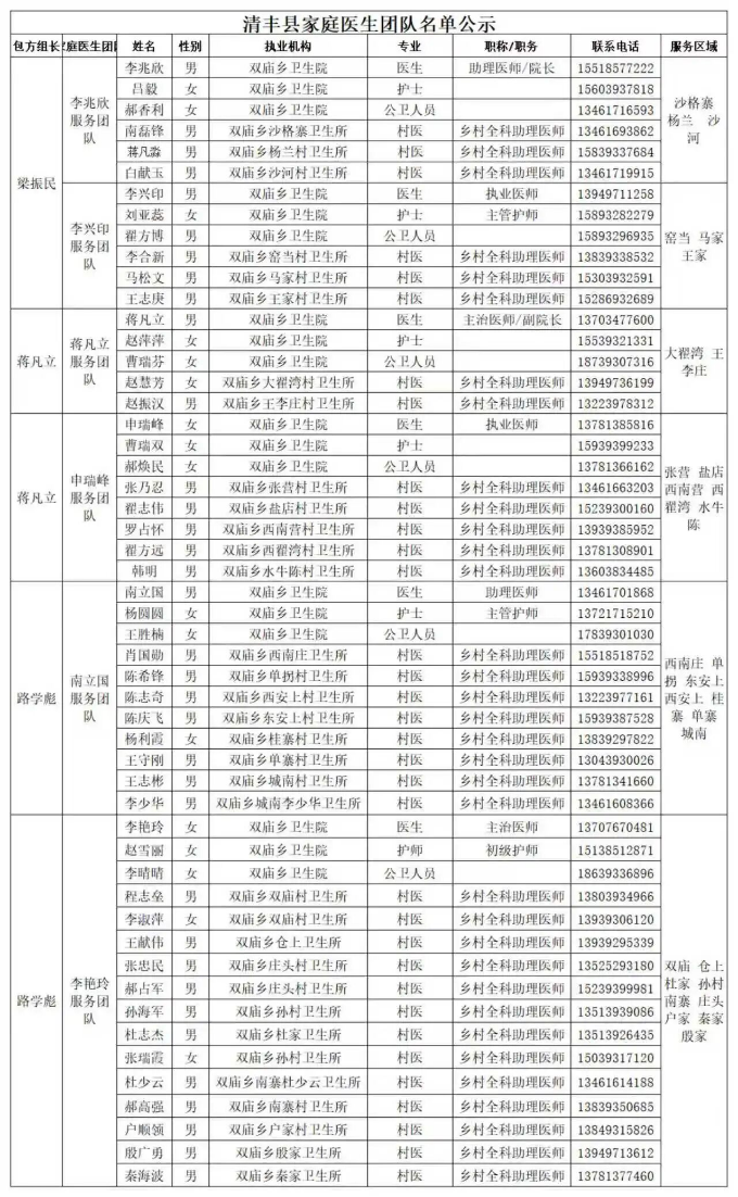 清丰县各乡镇家庭医生服务团队公示