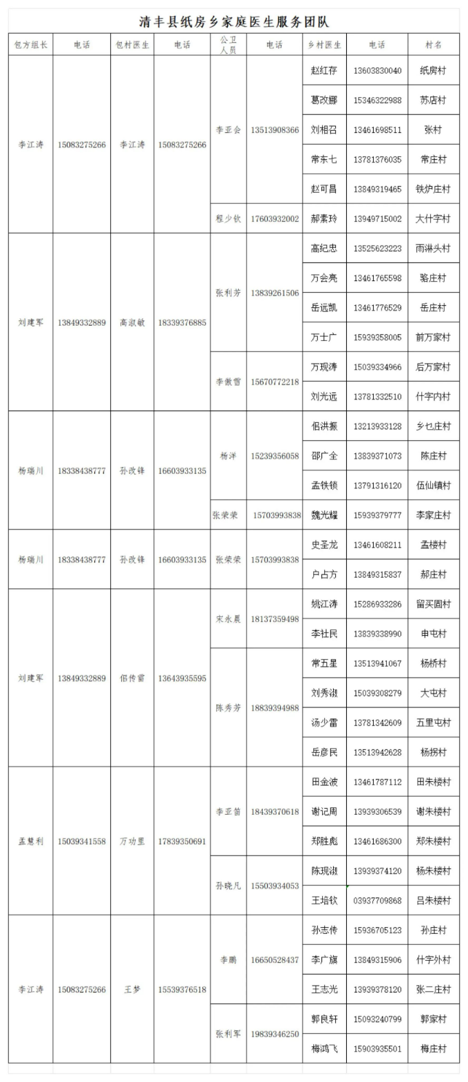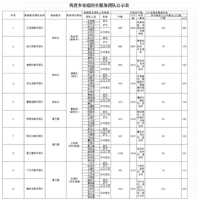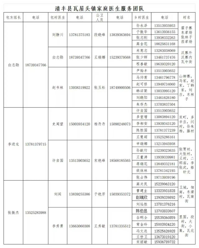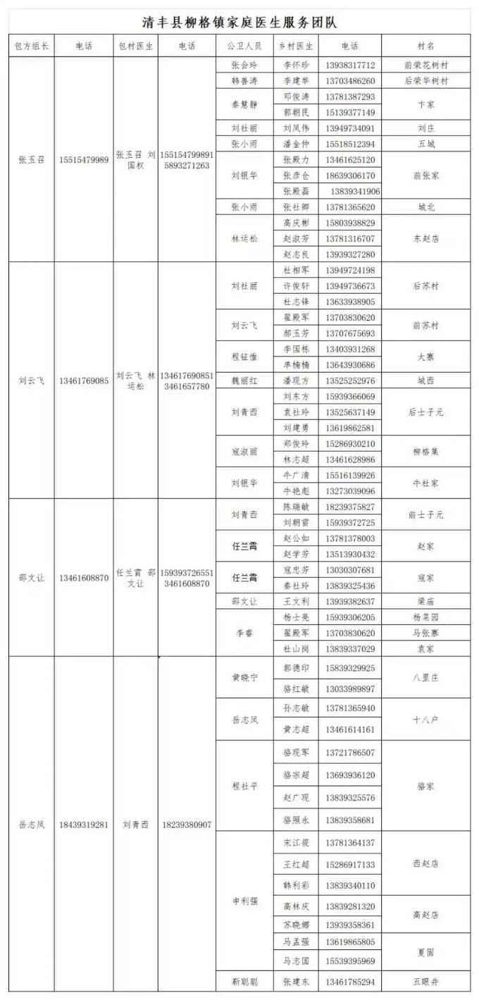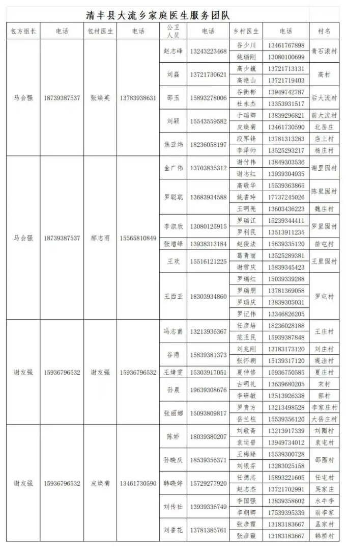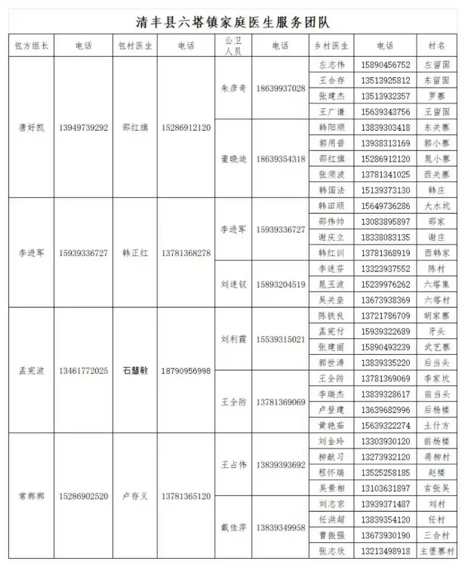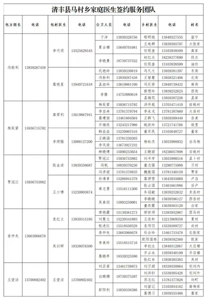 清丰县各乡镇家庭医生服务团队公示