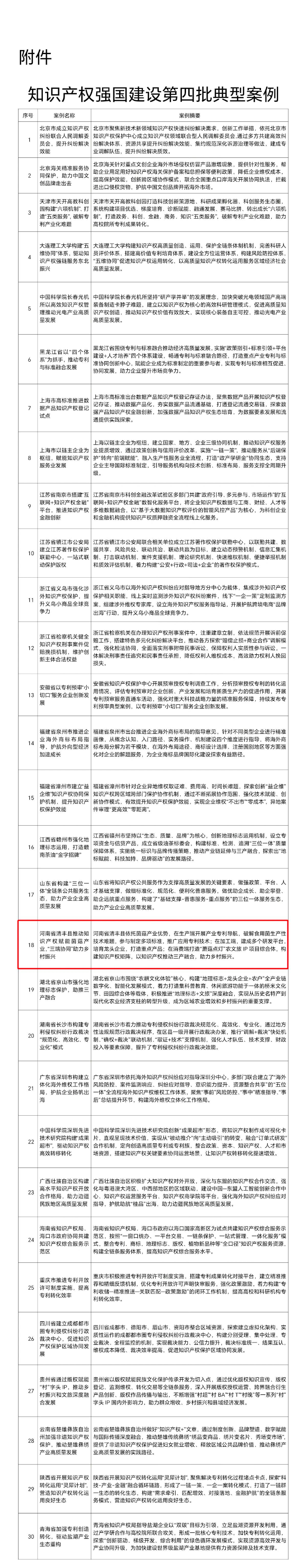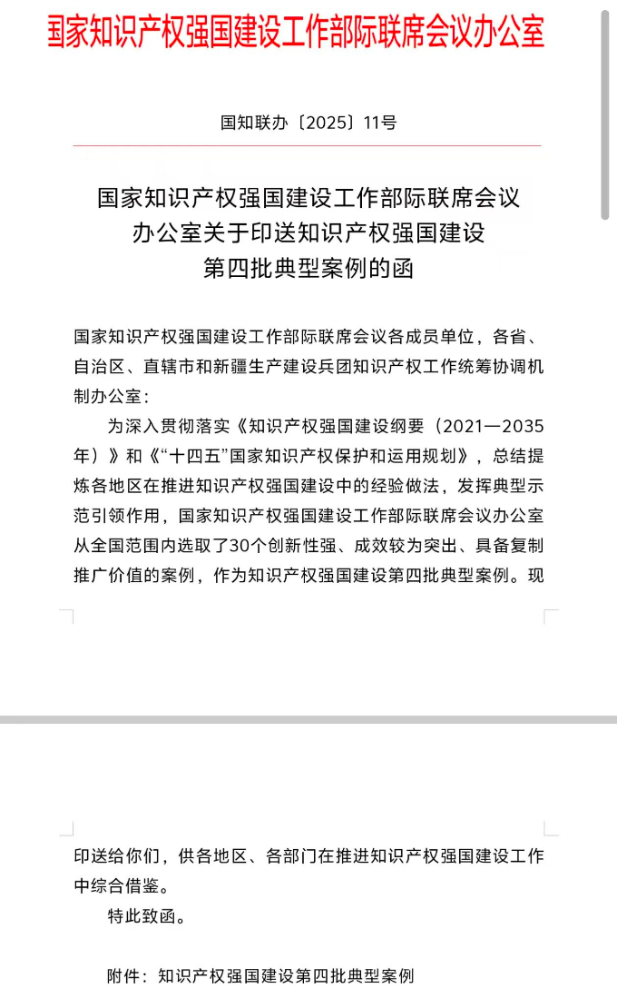 2025年10月,国家知识产权强国建设工作部际联席会议办公室印发《国家知识产权强国建设工作部际联席会议办公室关于印送知识产权强国建设第四批典型案例的函》,发布在全国范围内选取的30个创新性强、成效较为突出、具备复制推广价值的案例,作为知识产权强国建设第四批典型案例。其中,清丰县市场监督管理局报送的《河南省清丰县推动知识产权赋能菌菇产业,“三端协同”助力乡村振兴》成功入选。