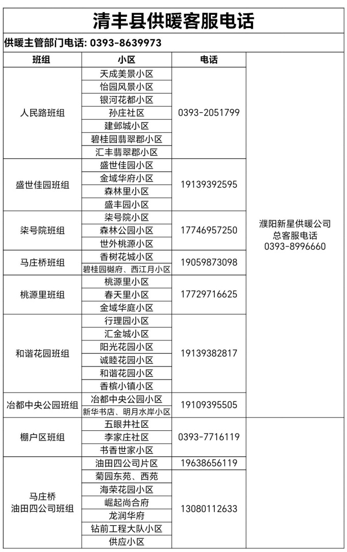 快收藏!清丰县供暖服务电话公布!