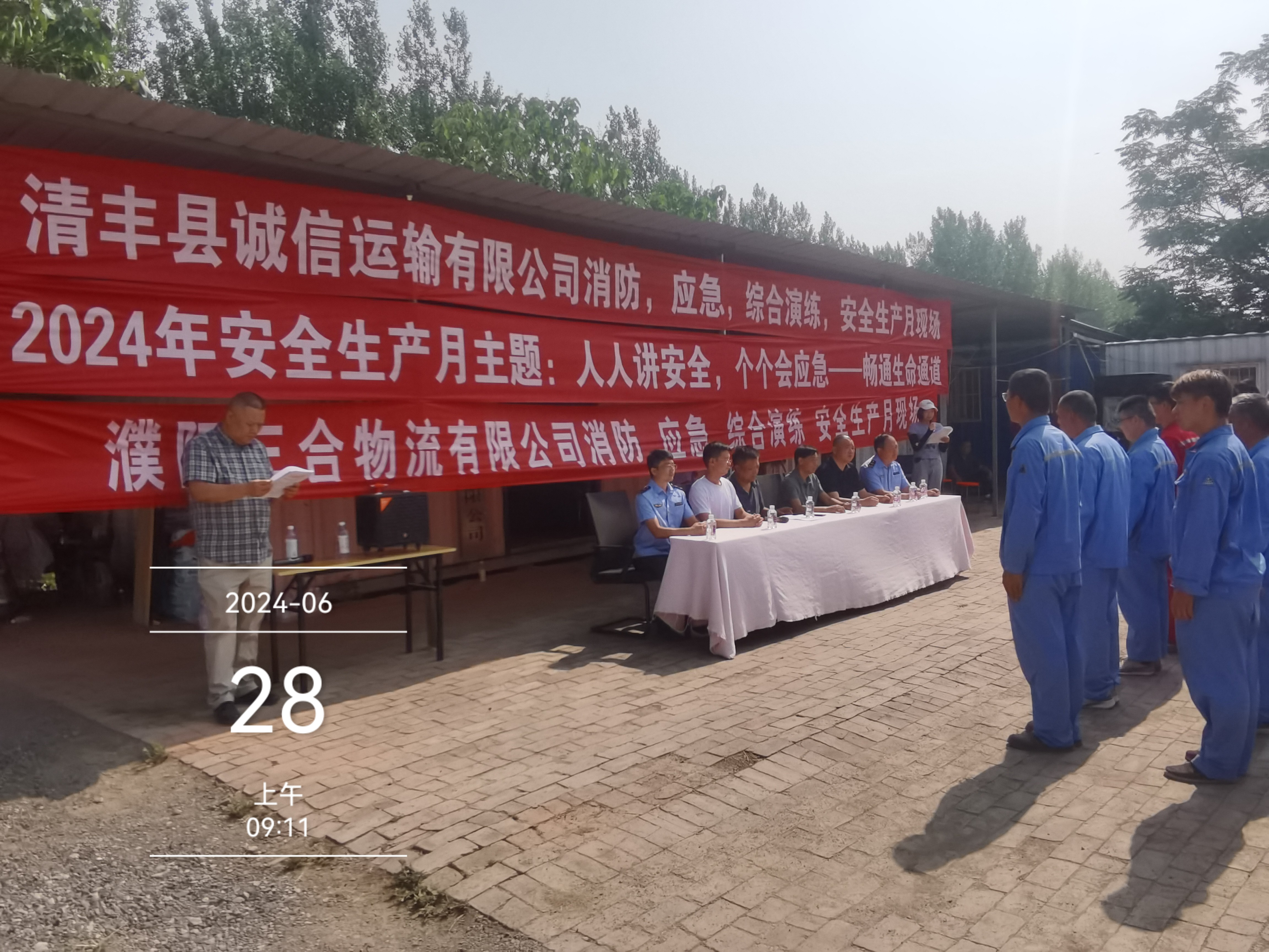 为进一步提高辖区危化品运输企业安全意识,增强企业应急处置能力,预防和减少道路交通事故的发生,6月28日,清丰县交通运输局以“人人讲安全、个个会应急——畅通生命通道”为主题,安排诚信运输有限公司和三合物流有限公司联合承办2024年危运企业安全生产月应急演练活动。演练活动由清丰县交通运输局牵头,县技术监督局、县交警大队、县交通运输局运输管理股、县交通事务中心全程指导,企业共计35余人参与。