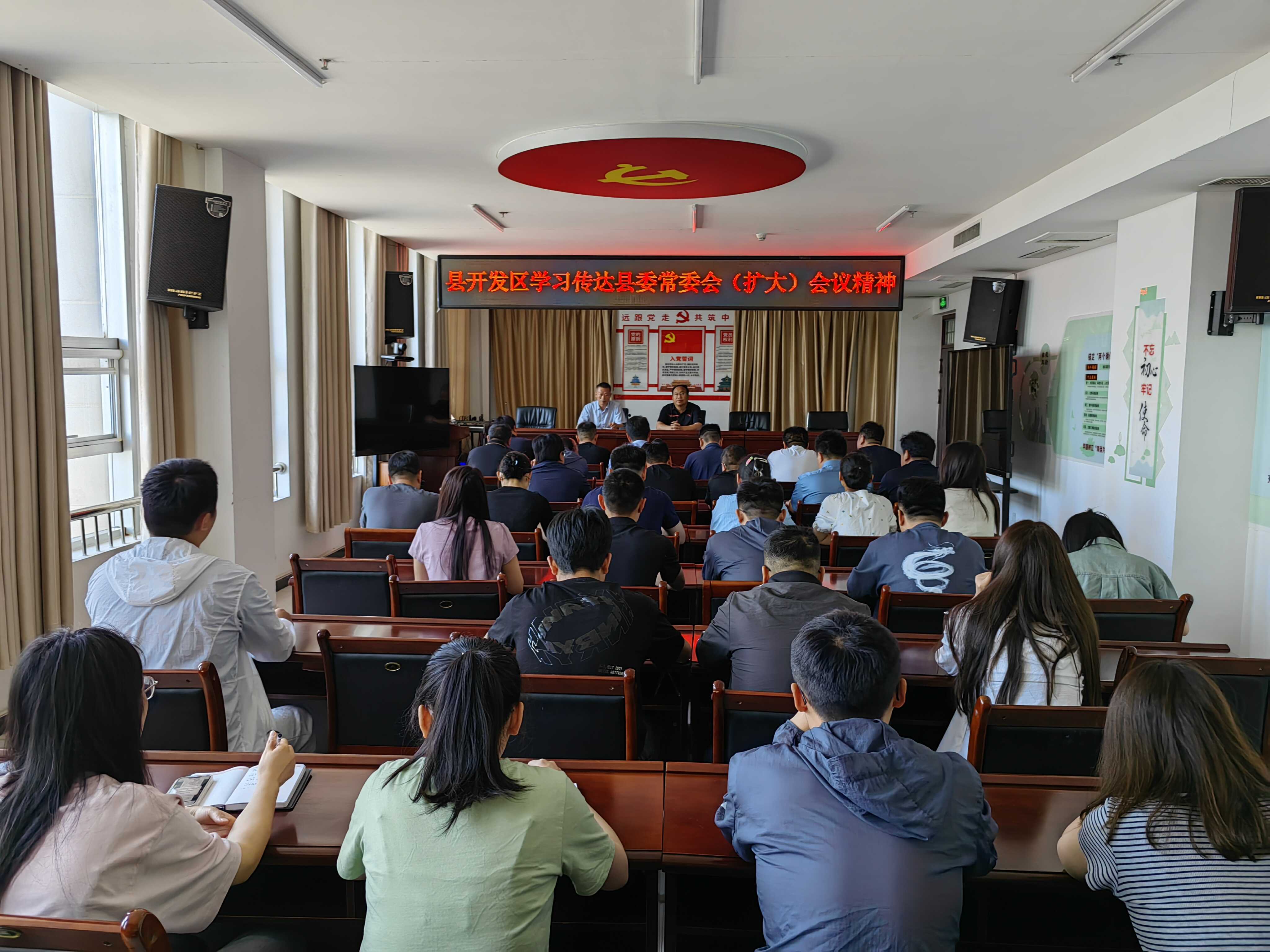 5月14日上午,县开发区召开全体会议,学习传达县委常委会(扩大)会议精神,党工委书记师敬川出席并发表讲话,党工委副书记、管委会副主任刘志防主持会议。