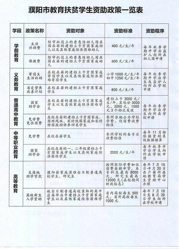 濮阳县:义务教育非寄宿生每年发放500元生活补助;大学新生每人2000元的资助。