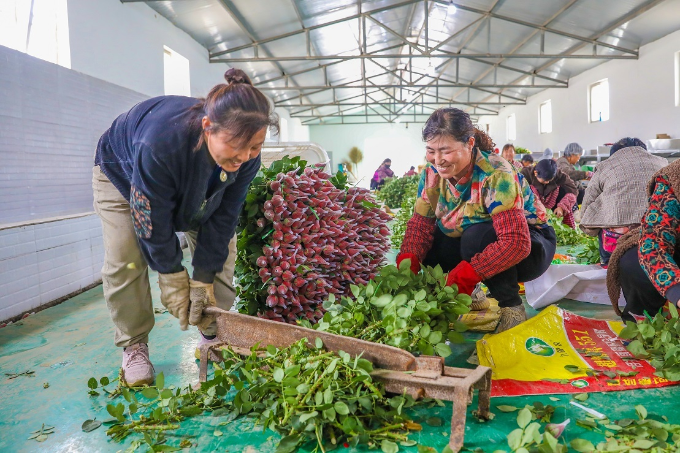 村民正在修剪采摘下来的玫瑰花 纪全举 摄