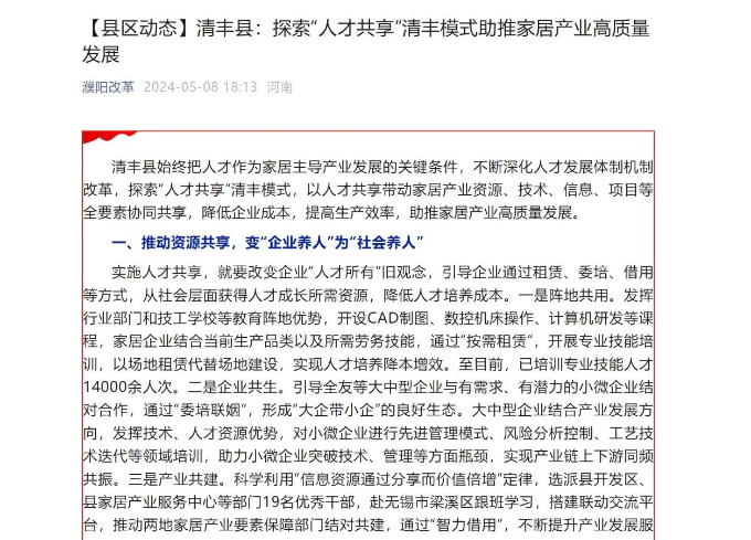 5月8日,“濮阳改革”公众号以《探索“人才共享”清丰模式 助推家居产业高质量发展》为题,刊发我县“人才共享”经验做法。