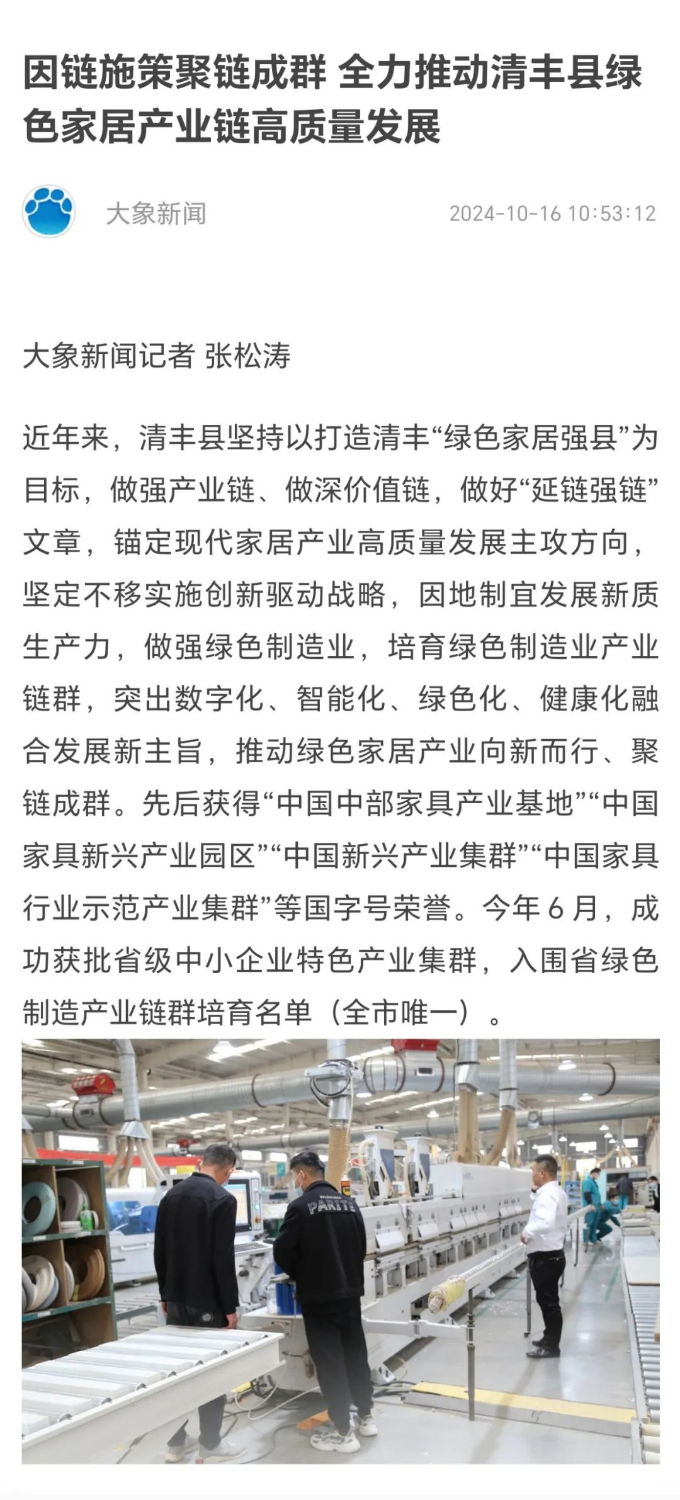 近年来,清丰县坚持以打造清丰“绿色家居强县”为目标,做强产业链、做深价值链,做好“延链强链”文章,锚定现代家居产业高质量发展主攻方向,坚定不移实施创新驱动战略,因地制宜发展新质生产力,做强绿色制造业,培育绿色制造业产业链群,突出数字化、智能化、绿色化、健康化融合发展新主旨,推动绿色家居产业向新而行、聚链成群。先后获得“中国中部家具产业基地”“中国家具新兴产业园区”“中国新兴产业集群”“中国家具行业示范产业集群”等国字号荣誉。今年6月,成功获批省级中小企业特色产业集群,入围省绿色制造产业链群培育名单(全市唯一)。