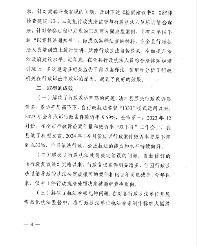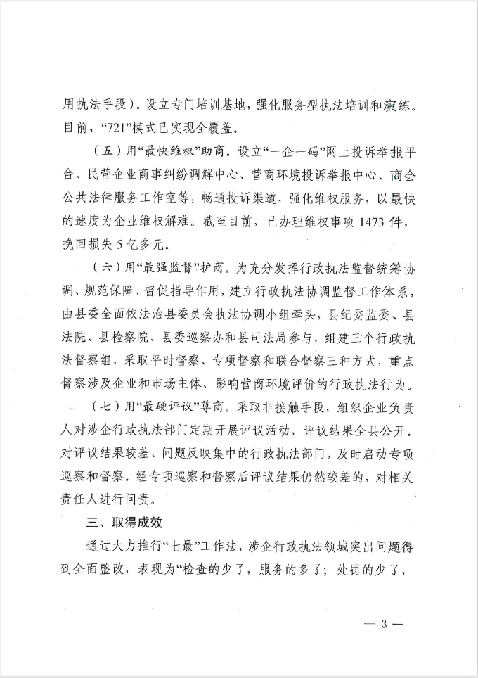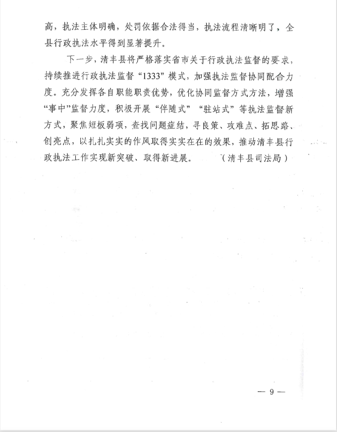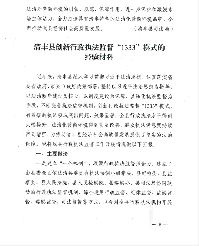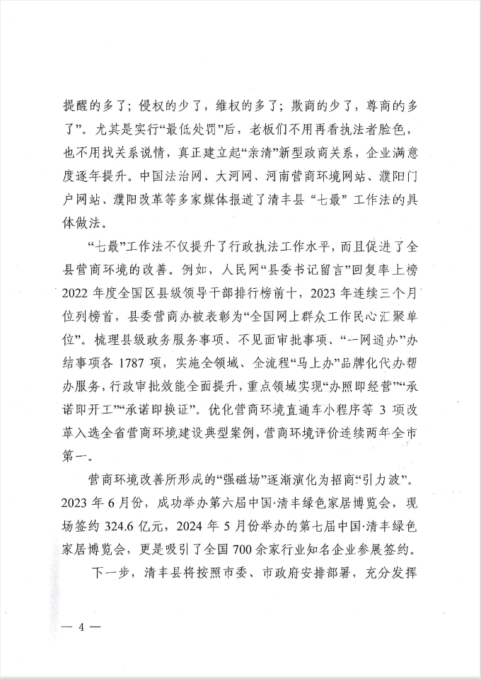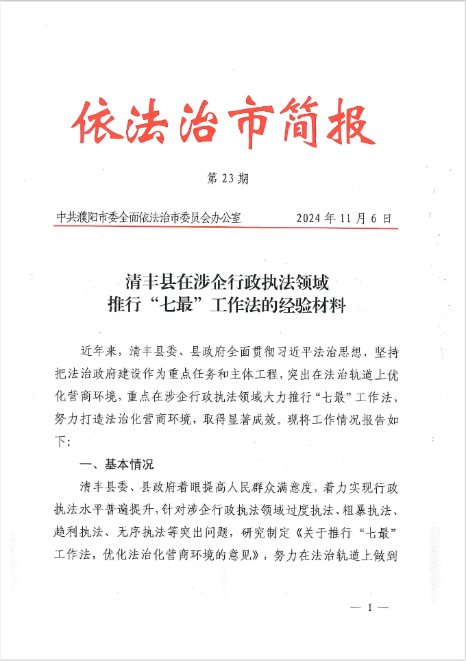 《依法治市简报》第23期,以《清丰县在涉企行政执法领域推行“七最”工作法的经验材料》、《清丰县创新行政执法监督“1133”模式的经验材料》为题,专期介绍了清丰县的工作经验。