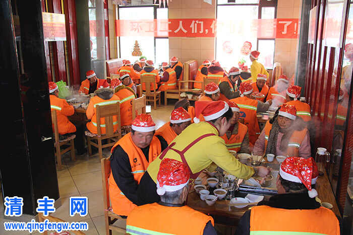 本网讯 12月25日,清丰县朝阳路中段一家火锅店欢声笑语,百余位环卫工人受邀聚集于此免费就餐,让他们感受到了严冬里的温暖。