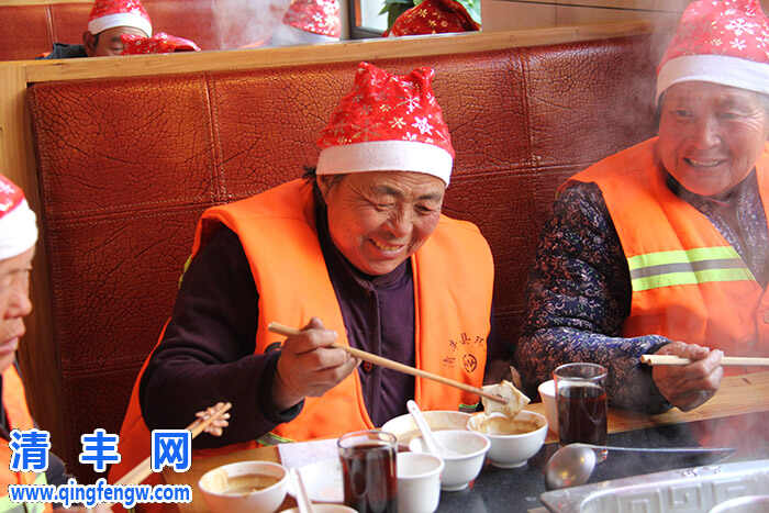 巴庄火锅店总经理王兰英表示,巴庄火锅来到清丰已经有四年了,一直想为我们县城的老百姓做点什么。当我们看到人们刚刚开始晨练的时候,他们就开始工作了,看到他们有时候吃的是凉馍、喝的是凉水,就感到他们是最辛苦的,借着今天的圣诞节,为了表达对他们的感谢,巴庄火锅宴请我们环卫工人来店里面吃饭,希望他们吃的开心、高兴,今后我们会继续为他们提供更好的服务。