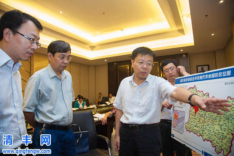 县长冯向军向调研组介绍我县现代农业园区试点项目有关情况。