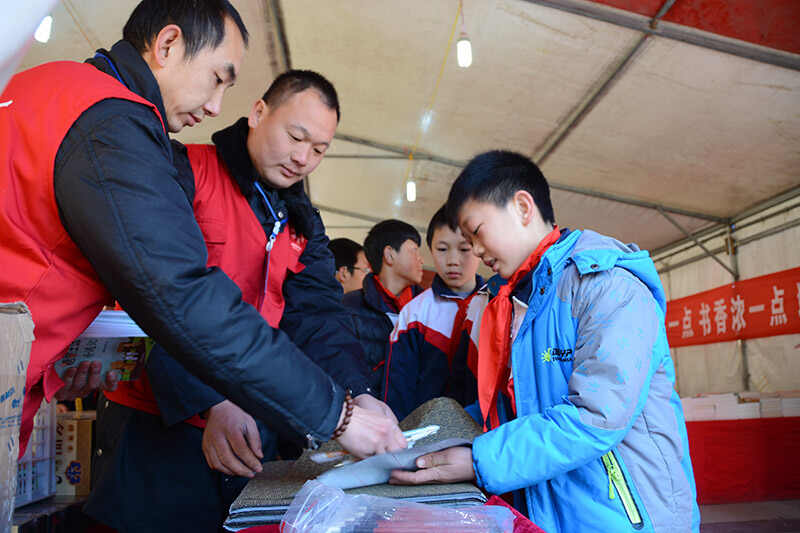志愿者在“书香清丰 全民阅读”志愿服务活动中为学生赠送图书和文具