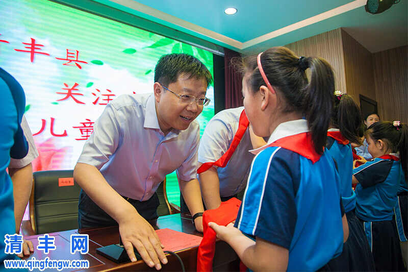 在明月湖小学,孩子们为县领导佩戴上了红领巾,县长冯向军与孩子们亲切的交流。冯向军说,六一”国际儿童节就要到了,祝孩子们节日快乐,并感谢广大教师为我县教育事业作出的无私奉献。看到孩子们就好像回到了四十年前,孩子是祖国的未来,是民族的希望。少年儿童时代是美好人生的开端,远大的理想在这里孕育,高尚的情操在这里萌生,良好的习惯在这里养成,生命的辉煌在这里奠基。希望你们要珍惜光阴,发奋读书,成为建设祖国、发展家乡的栋梁之材。