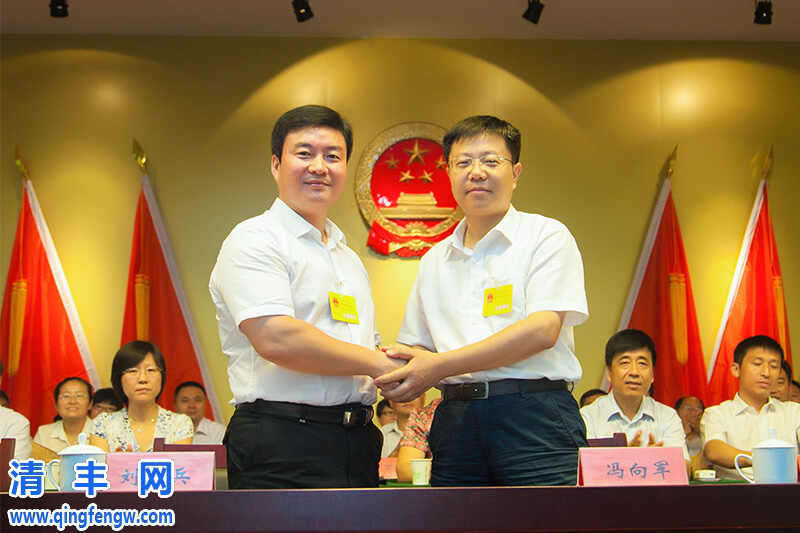 7月27日上午,在清丰县第十四届人民代表大会第七次会议上,县委书记冯向军与新当选的县长刘兵握手,表示祝贺。