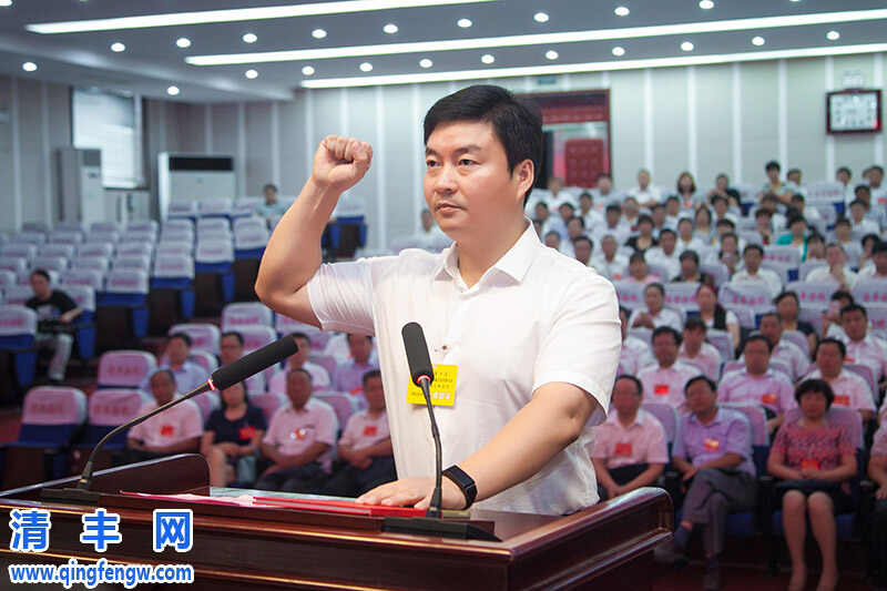 7月27日上午,在清丰县第十四届人民代表大会第七次会议上,新当选的清丰县人民政府县长刘兵面向国徽,抚按《中华人民共和国宪法》庄严宣誓。