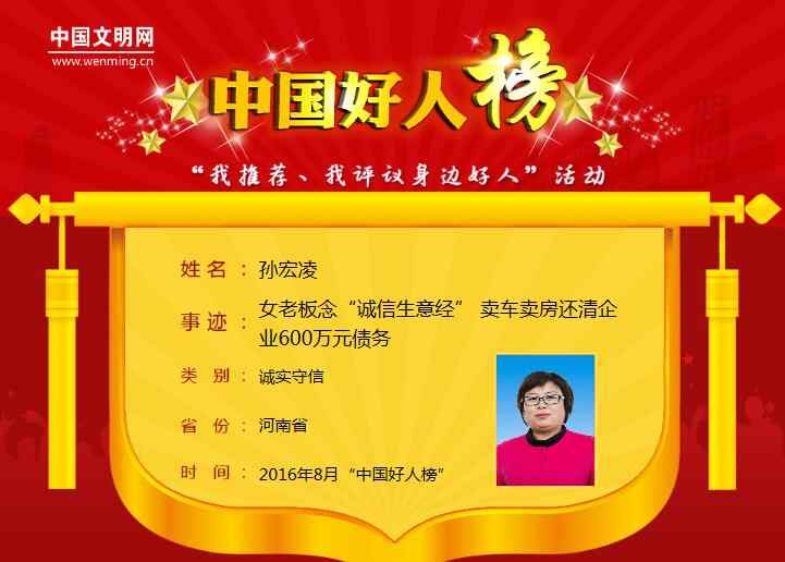 8月31日,记者自清丰县文明办获悉,中央文明办隆重发布的8月“中国好人榜”中,清丰籍女企业家孙宏凌榜上有名。