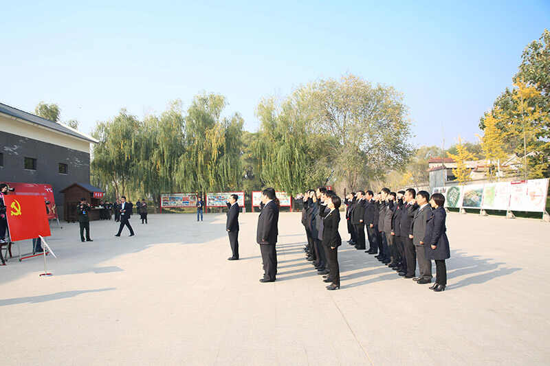 在冀鲁豫边区抗战史实展馆前,面对党旗,何雄领誓,市、县四大班子领导举起右手、紧握拳头,重温入党誓词。