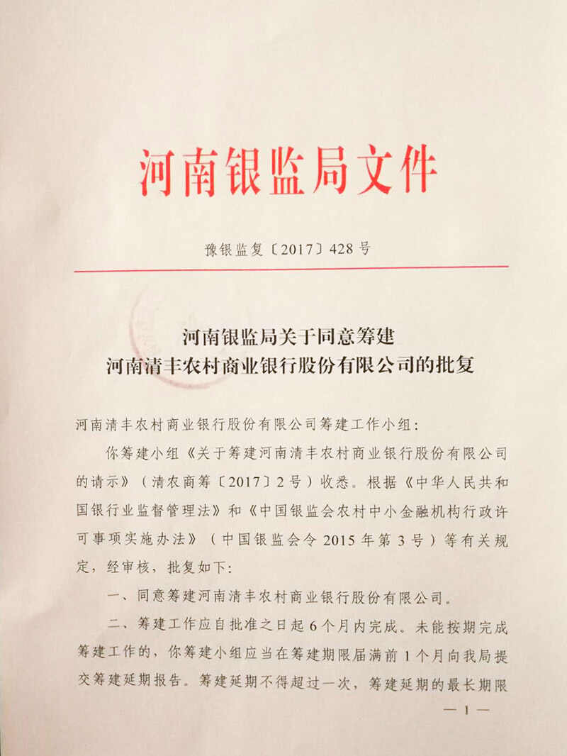 2017年12月28日,清丰县农村信用社改制组建农村商业银行喜获河南省银监局批准筹建。