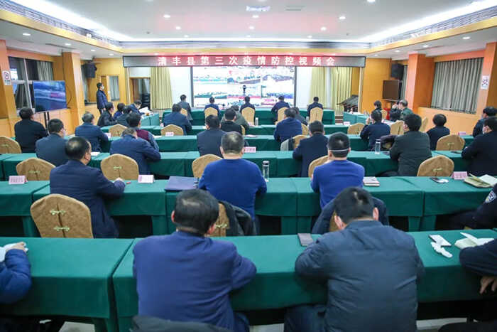 1月30日,清丰县召开新型冠状病毒感染的肺炎疫情防控第三次视频会议。冯向军、刘兵、潘奇峰、杨理宏、戚士杰等县领导出席会议,县直有关部门负责人在主会场参加会议,各乡镇有关人员在各分会场参加会议。