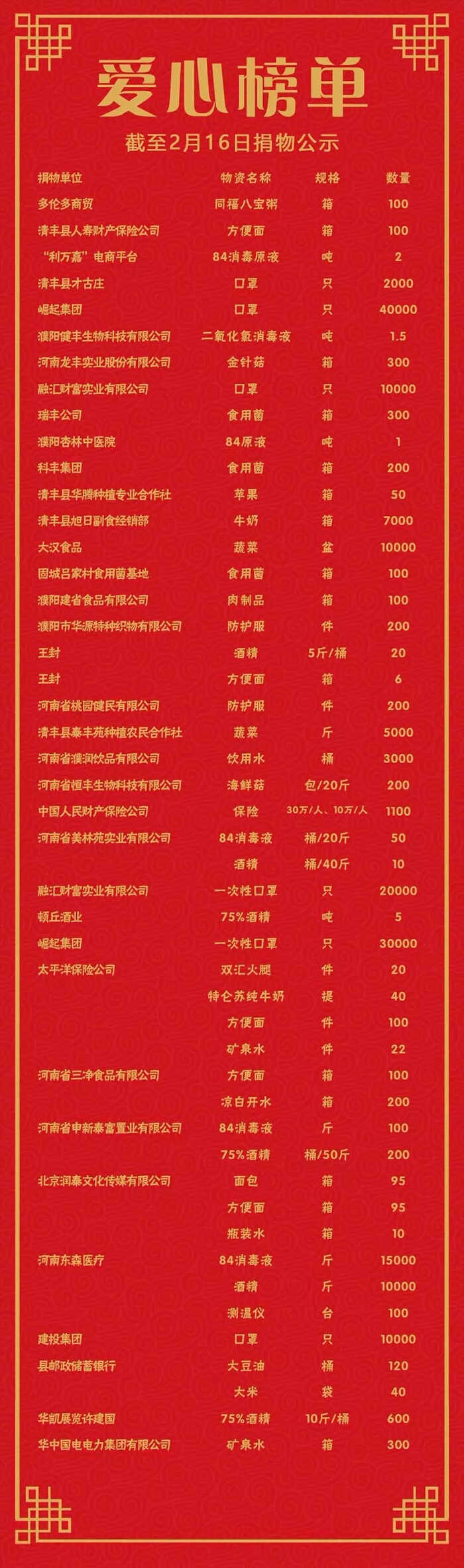 病毒无情人有情,众志成城战疫情。连日来,面对来势汹汹的新冠肺炎疫情,清丰县上下全员出动,风雨同舟,迅速投入到抗击疫情的攻坚战中,更有来自各行各业的普通人,大家慷慨解囊伸出援助之手,献出了自己的一份爱心,为我县当前全力以赴做好疫情防控工作增添了强大动力。