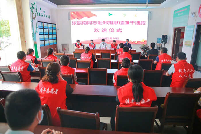 5月16日,清丰县古城乡卫生院职工张振南同志赴郑捐献造血干细胞欢送仪式在好人馆举行。副县长、县红十字会会长韩晓东,市红十字会张朝红主任出席仪式。