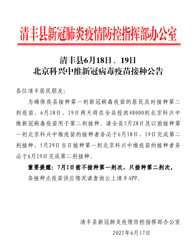 清丰县6月18日、19日北京科兴中维新冠病毒疫苗接种公告