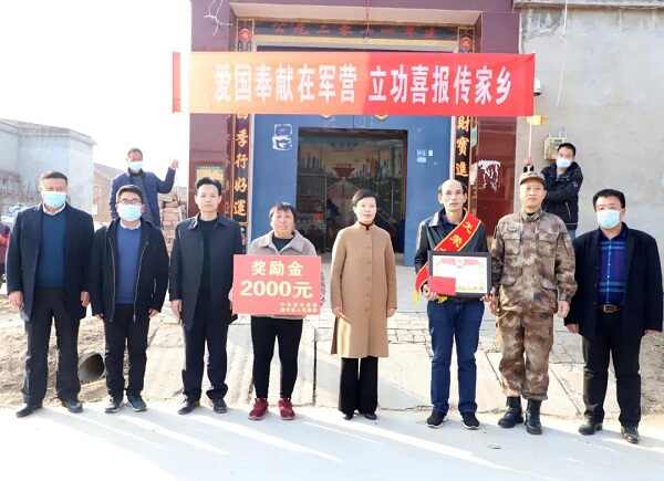11月16日,清丰县政府副县长、公安局局长张军英,县人武部部长张建秋到现役军人陈起飞家中为其家属送去立功喜报及党和政府的关心关爱,并将奖励金和慰问品送到他们的手中。县退役军人事务局负责人陪同。