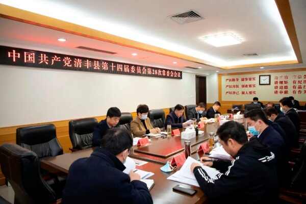 3月19日上午,县委书记曹拥军主持召开中国共产党清丰县第十四届委员会第28次常委会会议,传达学习十三届全国人大五次会议、全国政协十三届五次会议、中共中央政治局会议、中共中央政治局常务委员会会议、习近平总书记在十九届中共中央政治局第三十七次集体学习时的讲话等文件、会议精神,专题研究疫情防控、生态环保、安全生产、信访稳定、经济指标、招商引资、重点项目建设等工作,审议《中共清丰县委关于印发〈清丰县能力作风建设周调度会议制度〉的通知》、《中共清丰县委、清丰县人民政府关于成立清丰县实施“十大战略”工作领导小组及工作专班的通知》、《2022年清丰县重点项目建设大比武实施方案(试行)》、《新时代加强和改进思想政治工作的实施意见》等文件。赵丹、岳春青、王建国、丁振强、赵勋强、李养利、程春艳、张红伟参加会议,潘奇峰、戚士杰、张军英、纪泉水、王洪勋、靳卫军列席会议。