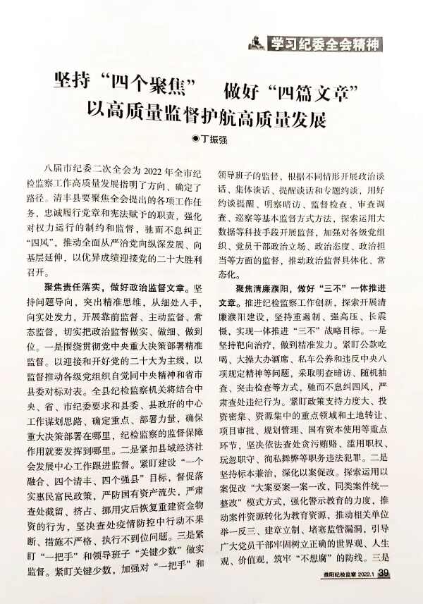 八届市纪委二次全会为2022年全市纪检监察工作高质量发展指明了方向、确定了路径。清丰县要聚焦全会提出的各项工作任务,忠诚履行党章和宪法赋予的职责,强化对权力运行的制约和监督,弛而不息纠正“四风”,推动全面从严治党向纵深发展、向基层延伸,以优异成绩迎接党的二十大胜利召开。