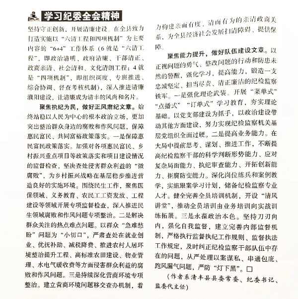 推进纪检监察工作创新,探索开展清廉濮阳建设,坚持重遏制、强高压、长震慑,实现一体推进“三不”战略目标。一是坚持靶向治疗,做到精准发力。紧盯公款吃喝、大操大办酒席、私车公养和违反中央八项规定精神等问题,采取明查暗访、随机抽查、突击检查等方式,驰而不息纠四风,严肃查处违纪行为。紧盯政策支持力度大、投资密集、资源集中的重点领域和土地转让、项目审批、规划管理、国有资本使用等重点环节,坚决依法查处贪污贿赂、滥用职权、玩忽职守、徇私舞弊等职务违法犯罪。二是坚持标本兼治,深化以案促改。探索运用以案促改“大案要案一案一改,同类案件统一整改”模式方式,强化警示教育的力度,推动案件资源转化为教育资源,推动相关单位举一反三、建章立制、堵塞监管漏洞,引导广大党员干部牢固树立正确的世界观、人生观、价值观,筑牢“不想腐”的防线。三是坚持守正创新,开展清廉建设。在全县致力打造实施以“六清工程和四项机制”为主要内容的“6+4”工作体系(6就是“六清工程”,即政治清明、政府清廉、干部清正、政商亲清、社会清和、文化清朗工程;4就是“四项机制”,即组织调度、专班推进、综合协调、督查考核机制),深入推进清廉濮阳建设,让清廉成为清丰的风尚和名片。