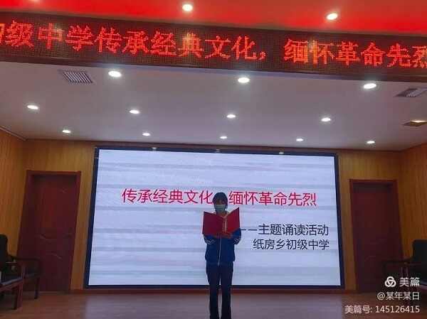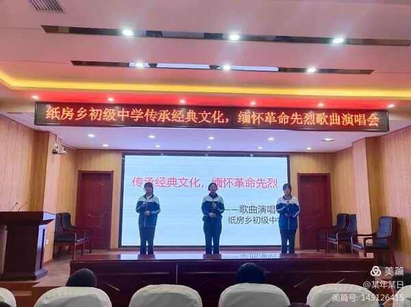 为弘扬爱国主义精神,提升爱国主义信念,增强爱国主义情怀,进一步加强社会主义精神文明建设,在清明节来临之际,纸房乡中学组织开展了中华经典传承诵读、缅怀革命先辈红色歌曲演唱会等清明节主题教育活动。